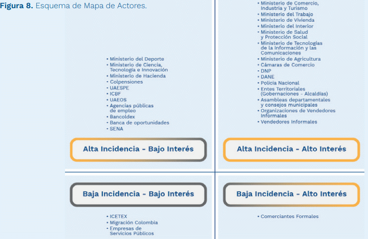 Que dentro de las estrategias trazadas para cada uno de los ejes de política, en el marco de los objetivos planteados, se identifica el liderazgo de las distintas entidades del orden nacional, departamental y municipal, como actores indispensables para reducir la informalidad laboral en la población dedicada a las ventas informales en espacio público, disminuir la incidencia de conflictividad por el uso y la convivencia en el espacio público y aumentar el impacto de programas dirigidos a los vendedores informales;