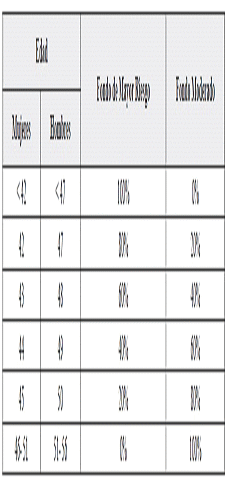 2. Convergencia al Fondo Moderado: el saldo de la cuenta individual de ahorro pensional de los afiliados no pensionados que no hayan elegido el tipo de fondo deberá converger al Fondo Moderado, de acuerdo a su género y edad. Para esta convergencia la Administradora trasladará recursos del Fondo de Mayor Riesgo al Fondo Moderado hasta que el saldo de dicha cuenta alcance en el Fondo Moderado el porcentaje mínimo indicado en el siguiente cuadro: