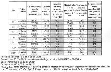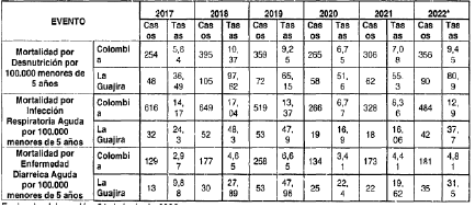Que el análisis de la carga de mortalidad en menores de cinco años para el periodo 2017-2022 muestra que del total de muertes por desnutrición que se presentaron en el país (n=1935), el 22,5% (n=435) ocurrió en el departamento de La Guajira. Con respecto a Infección Respiratoria Aguda (IRA) del total de muertes en el país (n=2.862) el 7,5% (n=216) se presentó en La Guajira y para Enfermedad Diarreica de las 1.052 muertes del país, en La Guajira ocurrieron 178 muertes que equivale al 16,9%.