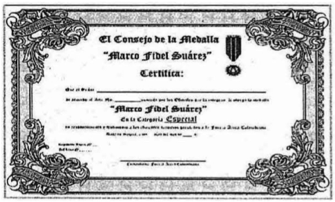 Que la Categoría Especial de la Medalla Militar “Marco Fidel Suárez” es también la insignia para agradecer y dejar constancia que la Institución, seguirá arropando el irrestricto empeño de continuar siendo los más devotos defensores de la soberanía y seguridad de la Patria; es por ello que la Fuerza Aérea Colombiana en su centenario de victorias, enaltecerá, exaltará y hará visible con el mayor decoro a quien se haga acreedor de esta presea;
