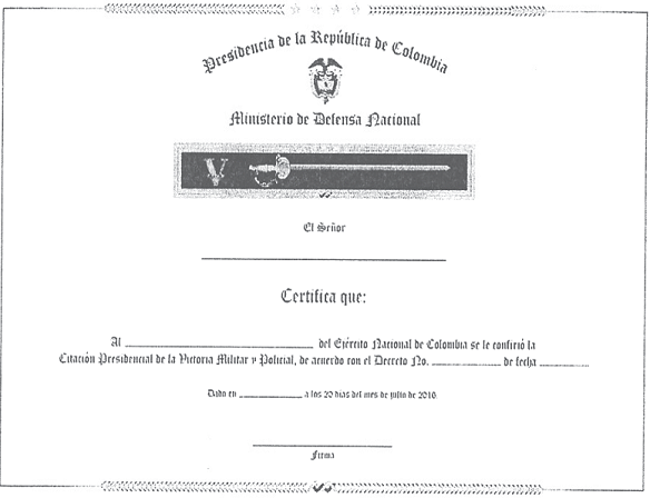 Horizontal. Dimensiones: Treinta y cinco centímetros (35 cm) de ancho, por Veinticinco centímetros (25 cm) de alto. Fuente tipográfica: Ord. Enlisa Texto MT. Imágenes: Escudo de Colombia y Citación Presidencial de la Victoria Militar y Policial. Textos: Los incluidos en el modelo presentado a continuación: