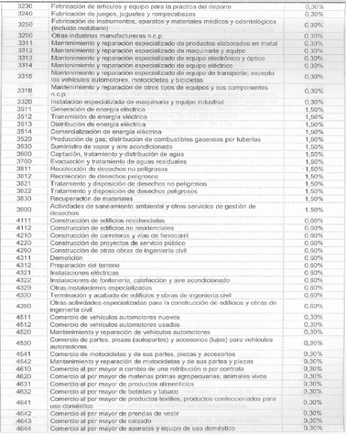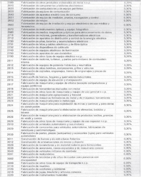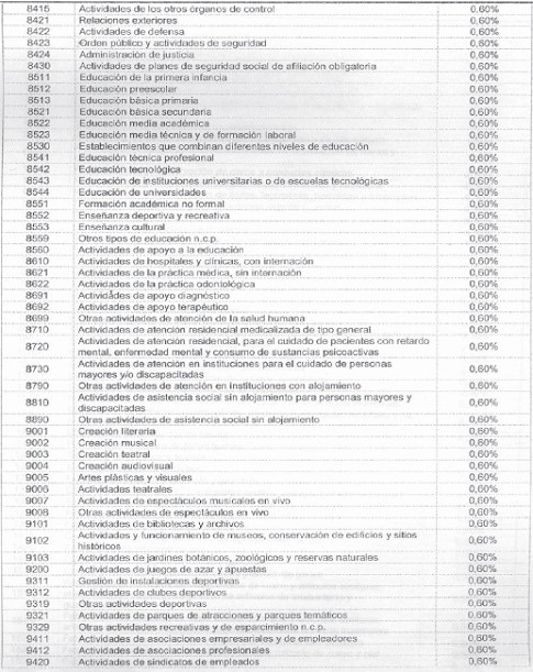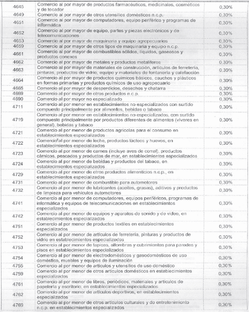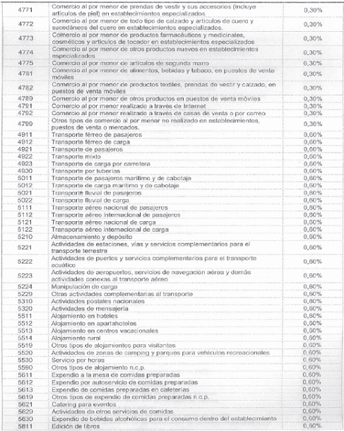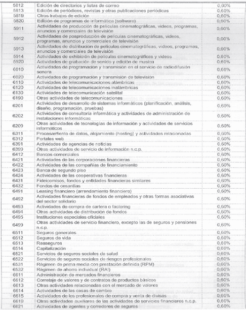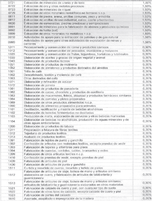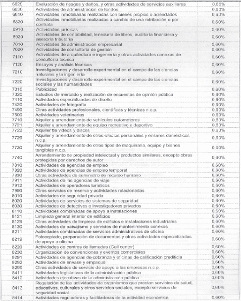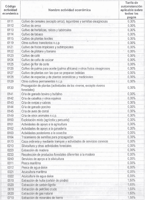 Para tal efecto, la autorretención de este impuesto se liquidará sobre cada pago o abono en cuenta realizado al contribuyente sujeto pasivo de este tributo, de acuerdo con las siguientes actividades económicas y a las siguientes tarifas: