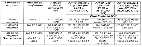 "Artículo 2.2.4.11.5. Criterio de proporcionalidad y razonabilidad para la cuantía de la sanción a los empleadores. Se establecen los criterios de proporcionalidad y razonabilidad, conforme al tamaño de la empresa de acuerdo a lo prescrito en el artículo 2 de la Ley 590 de 2000, modificado por el artículo 2 de la Ley 905 de 2004 y el artículo 51 de la Ley 1111 de 2006 y conforme a lo establecido en los artículos 13 y 30 de la Ley 1562 de 2012 y con base en los siguientes parámetros: