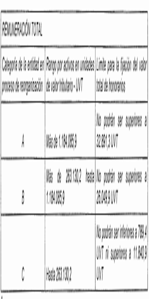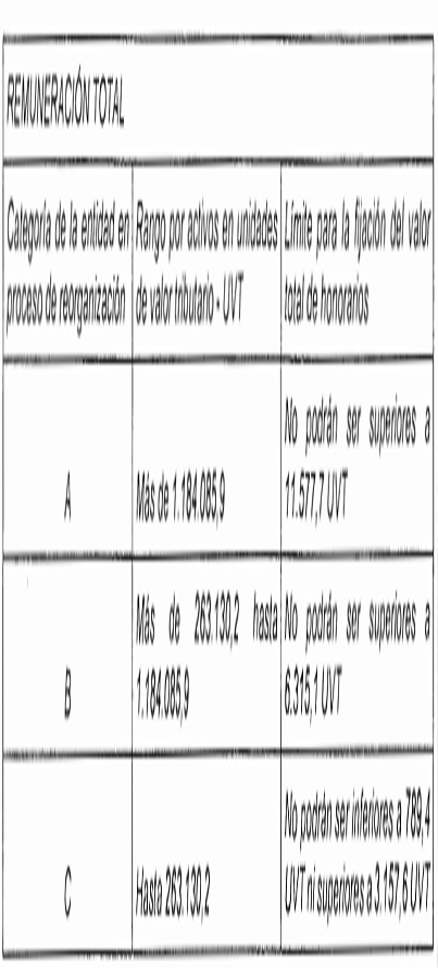 "Para el cálculo del valor de la remuneración total del liquidador, se tendrá como base el monto de los activos de la entidad en proceso de liquidación, al cual se le aplicarán los límites establecidos en la siguiente tabla, según corresponda, de acuerdo con la categoría a la que pertenezca la entidad en proceso de liquidación: