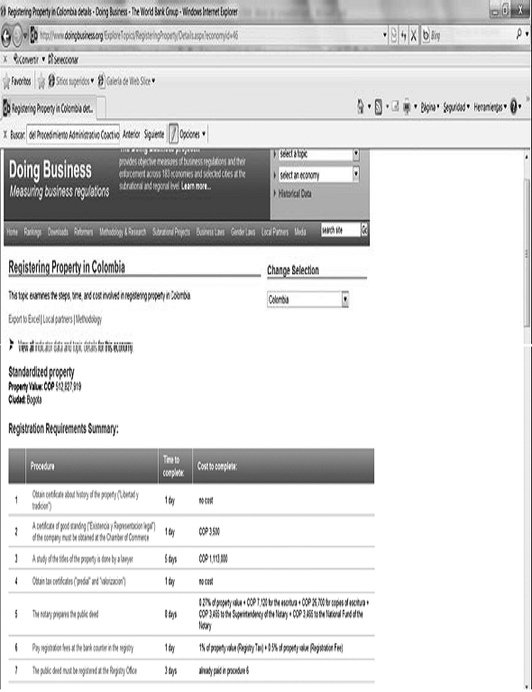 Por último, conviene señalar que los esfuerzos que emprendamos en esta materia van a lograr demostrar una mejora sustancial en la posición de Colombia en el estudio Doing Business que realiza anualmente el Banco Mundial, ya que el mencionado informe para la versión 2010 publicada en septiembre pasado, aún referencia tiempos de respuesta promedio en Notarías de 8 días para Bogotá, como se puede observar en el siguiente gráfico.