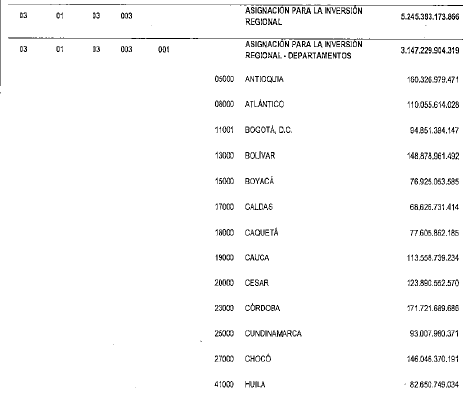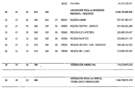 PARÁGRAFO 3o, Asignación para la Inversión Regional. En el rubro 03-01-03-003, correspondiente a la "Asignación para la Inversión Regional”, se incorporan la totalidad de las autorizaciones máximas de gasto estimadas por este concepto para el bienio 2021-2022 y sus desagregaciones en los departamentos y las regiones, atendiendo los criterios establecidos en los artículos 44 y 45 de la Ley 2056 de 2020.