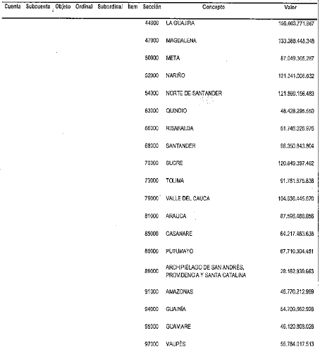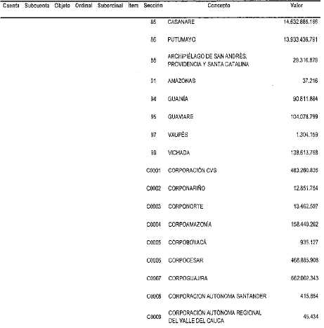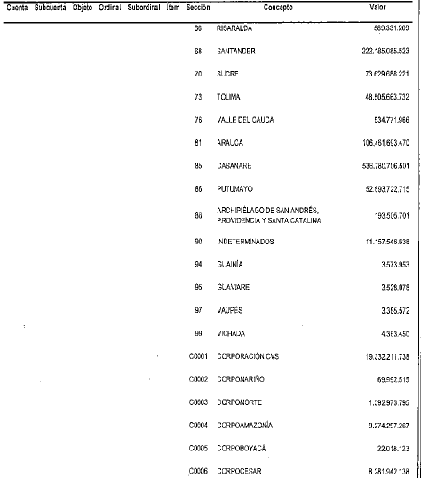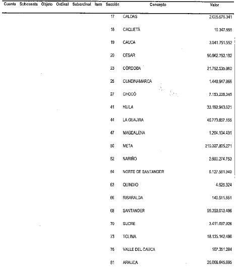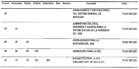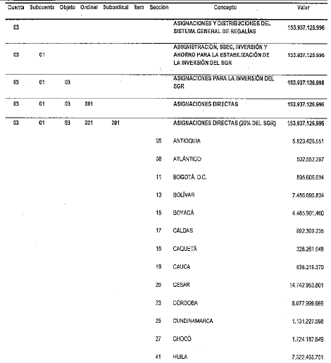 NOTAS DE VIGENCIA: - Mediante la Resolución 2271 de 2023, '(...) se ajustan los valores de las rentas constitutivas de los recursos de capital del Presupuesto General de la Nación de la vigencia fiscal de 2023', publicada en el Diario Oficial No. 52.515 de 11 de septiembre de 2023. Rige a partir de su publicación en el Diario Oficial. - Mediante el Decreto 443 de 2023, '(...) se incorpora al presupuesto del bienio 2023-2024 del Sistema General de Regalías el mayor recaudo generado en la bienalidad 2021-2022 y se dictan otras disposiciones', publicado en el Diario Oficial No. 52.351 de 29 de marzo de 2023. Rige a partir de su publicación en el Diario Oficial. - Mediante el Decreto 363 de 2023, '(...) se cierra el presupuesto de la vigencia 2021-2022 y se adiciona el Presupuesto del bienio 2023-2024 del Sistema General de Regalías (SGR), incorporando la Disponibilidad Inicial 2023-2024, los reintegros realizados a la Cuenta Única del SGR y la distribución de los ingresos por medidas sancionatorias de multas', publicado en el Diario Oficial No. 52.338 de 16 de marzo de 2023. Rige a partir de su publicación en el Diario Oficial. - Mediante el Decreto 1412 de 2022, '(...) se incorporan al presupuesto del bienio 2021-2022 del Sistema General de Regalías los rendimientos financieros generados por las Asignaciones Directas antes del 31 de diciembre de 2020 pendientes de incorporar y los generados del 1o de enero de 2022 al 30 de junio de 2022', publicado en el Diario Oficial No. 52.110 de 29 de julio de 2022. - Mediante el Decreto 956 de 2022, '(...) se ajustan los anexos de Asignaciones Directas del presupuesto del bienio 2021-2022 del Sistema General de Regalías y se dictan otras disposiciones', publicado en el Diario Oficial No. 52.055 de 4 de junio de 2022. - Mediante la Resolución 468 de 2022, '(...) se homologan recursos asignados en el Presupuesto del Sistema General de Regalías de la vigencia 2021-2022, en el rubro “Asignación para la Inversión Regional- Departamentos Art. 209 de la Ley 2056 de 2020” al rubro presupuestal “Asignación para la Inversión Regional- Departamentos', publicada en el Diario Oficial No. 51.956 de 22 de febrero de 2022. - Mediante el Decreto 169 de 2022, '(...) se incorporan al presupuesto del bienio 2021-2022 el Sistema General de Regalías, los rendimientos financieros generados por las Asignaciones Directas del 1 de julio de 2021 al 31 de diciembre de 2021', publicado en el Diario Oficial No. 51.934 de 31 de enero de 2022. - Mediante el Decreto 1741 de 2021, ' (...) se ajusta el presupuesto del bienio 2021-2022 del Sistema General de Regalías, trasladando recursos del rubro “Asignación para la Inversión Regional, Compensación Beneficiarios de Asignaciones directas Año 2020” a los rubros “Asignaciones Directas (20% del SGR)” y “Asignación para la Inversión Regional, Departamentos” ', publicado en el Diario Oficial No. 51.890 de 16 de diciembre de 2021. - Mediante el Decreto 850 de 2021, '(...) se incorporan al presupuesto del bienio 2021-2022 del Sistema General de Regalías, los rendimientos financieros generados por las Asignaciones Directas del 1 de enero de 2021 al 30 de junio de 2021', publicado en el Diario Oficial No. 51.751 de 30 de julio de 2021. - Mediante la Resolución 533 de 2023, '(...) se incorporan en el presupuesto del bienio 2021-2022 los recursos asignados al Departamento Nacional de Planeación como administrador del Sistema de Seguimiento, Evaluación y Control del Sistema General de Regalías', publicada en el Diario Oficial No. 52.376 de 25 de abril de 2023. Rige a partir de su expedición. - Mediante la Resolución 532 de 2 de marzo de 2021, '(...) se incorporan recursos adicionales para el funcionamiento del Sistema General de Regalías del Departamento Nacional de Planeación como administrador del Sistema de Seguimiento, Evaluación y Control del SGR” en el bienio 2021-2022', publicada en el Diario Oficial No. 52.376 de 25 de abril de 2023. Rige a partir de su expedición. - Mediante la Resolución 531 de 2 de marzo de 2021, '(...) se incorporan recursos adicionales para el Presupuesto de funcionamiento del Sistema General de Regalías del Departamento Nacional de Planeación en el bienio 2021-2022', publicada en el Diario Oficial No. 52.376 de 25 de abril de 2023. Rige a partir de su expedición. - Mediante el Decreto 332 de 2021, '(...) se adiciona el presupuesto del bienio 2021-2022 del Sistema General de Regalías con ocasión del Desahorro del Fondo de Ahorro y Estabilización', publicado en el Diario Oficial No. 51.637 de 6 de abril de 2021. - Mediante el Decreto 317 de 2021, '(...) se cierra el presupuesto de la vigencia 2019-2020 y se adiciona el presupuesto del bienio 2021-2022 del Sistema General de Regalías incorporando la Disponibilidad Inicial 2021-2022 y el saldo del mayor recaudo 2017-2018', publicado en el Diario Oficial No. 51.632 de 30 de marzo de 2021. |