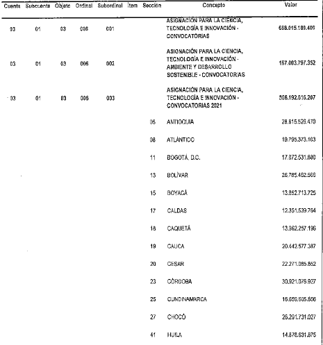 PARÁGRAFO 5o. Asignación para la Ciencia, Tecnología e Innovación. En el rubro 03-01-03-006, correspondiente a la "Asignación para la Ciencia, Tecnología e Innovación" se Incorporan la totalidad de las autorizaciones máximas de gasto estimadas por este concepto para el bienio 2021-2022 y sus desagregaciones agrupadas en cabeza de los departamentos para el año 2021, atendiendo lo dispuesto en el artículo 52 de la Ley 2056 de 2020.