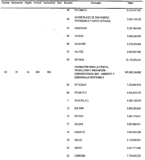 - Presupuesto modificado por el Decreto 1412 de 2022, '(...) se incorporan al presupuesto del bienio 2021-2022 del Sistema General de Regalías los rendimientos financieros generados por las Asignaciones Directas antes del 31 de diciembre de 2020 pendientes de incorporar y los generados del 1o de enero de 2022 al 30 de junio de 2022', publicado en el Diario Oficial No. 52.110 de 29 de julio de 2022. - Presupuesto modificado por el Decreto 169 de 2022, '(...) se incorporan al presupuesto del bienio 2021-2022 el Sistema General de Regalías, los rendimientos financieros generados por las Asignaciones Directas del 1 de julio de 2021 al 31 de diciembre de 2021', publicado en el Diario Oficial No. 51.934 de 31 de enero de 2022. - Presupuesto modificado por el Decreto 850 de 2022, '(...) se incorporan al presupuesto del bienio 2021-2022 del Sistema General de Regalías, los rendimientos financieros generados por las Asignaciones Directas del 1 de enero de 2021 al 30 de junio de 2021', publicado en el Diario Oficial No. 51.751 de 30 de julio de 2021. - Presupuesto modificado por el Decreto 332 de 2022, '(...) se adiciona el presupuesto del bienio 2021-2022 del Sistema General de Regalías con ocasión del Desahorro del Fondo de Ahorro y Estabilización', publicado en el Diario Oficial No. 51.637 de 6 de abril de 2021. - Presupuesto modificado por el Decreto 317 de 2022, '(...) se cierra el presupuesto de la vigencia 2019-2020 y se adiciona el presupuesto del bienio 2021-2022 del Sistema General de Regalías incorporando la Disponibilidad Inicial 2021-2022 y el saldo del mayor recaudo 2017-2018', publicado en el Diario Oficial No. 51.632 de 30 de marzo de 2021. |
