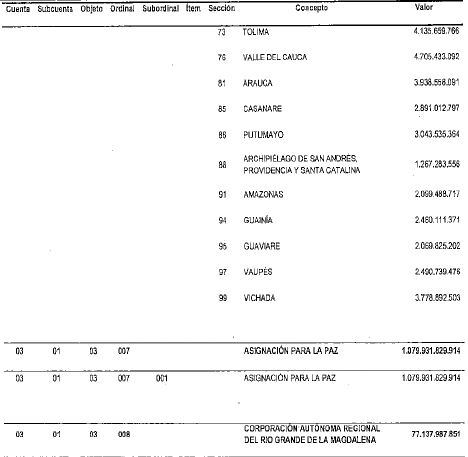 2. De los recursos incorporados en el numeral 1 del presente artículo, destínese la suma de SETENTA Y CINCO MIL CUATROCIENTOS VEINTISIETE MILLONES NOVECIENTOS OCHENTA Y SIETE MIL TRESCIENTOS VEINTITRES PESOS MONEDA LEGAL {$75.427.987.323), al Presupuesto de Gastos de la Asignación para la Paz en cumplimiento de lo establecido en el numeral 2 del artículo 152 de la Ley 2056 de 2020, según el siguiente detalle: