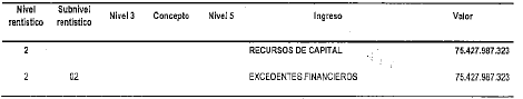 1. Incorpórese al Presupuesto de Ingresos del Sistema General de Regalías para el bienio del 1o de enero de 2021 al 31 de diciembre de 2022, la suma de SETENTA Y CINCO MIL CUATROCIENTOS VEINTISIETE MILLONES NOVECIENTOS OCHENTA Y SIETE MIL TRESCIENTOS VEINTITRES PESOS MONEDA LEGAL ($75.427.987.323), que corresponden a los excedentes financieros del Sistema General de Regalías que serán utilizados en un primer momento para garantizar el adelanto para la Paz de conformidad con el literal a del artículo 62 de la Ley 2056 de 2020, así: