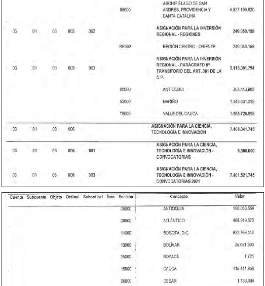 PARÁGRAFO 3o. Asignación para la Inversión Regional. En el rubro 03-01-03-003, correspondiente a la “Asignación para la Inversión Regional”, se incorporan la totalidad de las autorizaciones máximas de gasto estimadas por este concepto para el bienio 2025-2026 y sus desagregaciones en los departamentos y las regiones, atendiendo los criterios establecidos en los artículos 44 y 45 de la Ley 2056 de 2020.