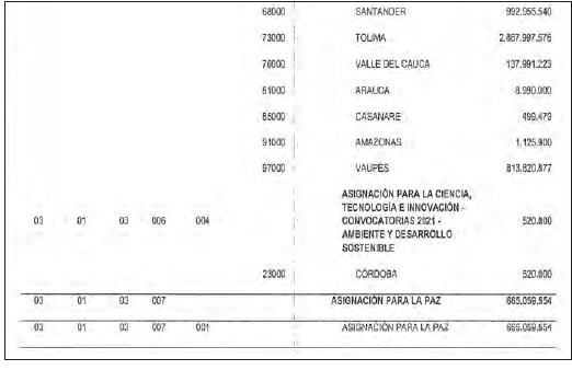 2. De los recursos incorporados en el numeral anterior, destínese la suma cinco billones ciento sesenta y seis mil doscientos ocho millones novecientos setenta y ocho mil ochocientos quince pesos ($5.166.208.978.815) moneda legal, a la Asignación para la Paz y a incentivar la producción de municipios en cuyos territorios se exploten los recursos naturales no renovables y a los municipios y distritos con puertos marítimos y fluviales por donde se transporten dichos recursos o derivados de los mismos, en cumplimiento del parágrafo 7 transitorio del artículo 2o del Acto Legislativo número 04 de 2017 que modifica el artículo 361 de la Constitución Política y el parágrafo 2 del artículo 57 de la Ley 2056 de 2020, según el siguiente detalle:
