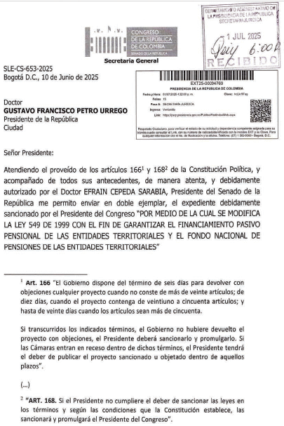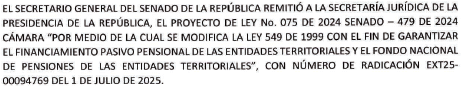 Teniendo en cuenta lo anterior y como quiera que la Presidencia devuelve el Proyecto de Ley número 75 de 2024 Senado, 479 de 2024 Cámara, por medio de la cual se modifica la Ley 549 de 1999 con el fin de garantizar el financiamiento pasivo pensional de las entidades territoriales y el fondo nacional de pensiones de las entidades territoriales, sin la correspondiente sanción ejecutiva, el Presidente del Congreso de la República, imparte la sanción correspondiente.