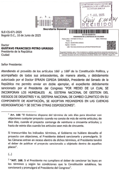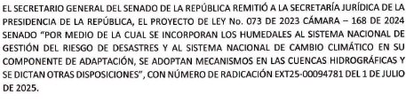 Teniendo en cuenta lo anterior y como quiera que la Presidencia devuelve el Proyecto de Ley número 168 de 2024 Senado, 073 de 2023 Cámara, por medio de la cual se incorporan los humedales al Sistema Nacional de Gestión del Riesgos de Desastres y al Sistema Nacional de Cambio Climático en su Componente de Adaptación, se adoptan mecanismos en las cuencas hidrográficas y se dictan otras disposiciones, sin la correspondiente sanción ejecutiva, el Presidente del Congreso de la República, imparte la sanción correspondiente.