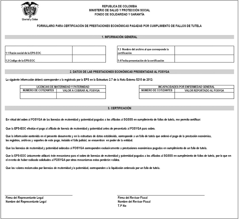 Cuando la EPS presente al Fosyga cobro de licencias correspondientes al tipo 12 “Cumplimiento Fallo de Tutela” del Campo No. 20, deberá entregar junto con la estructura de datos la siguiente certificación: