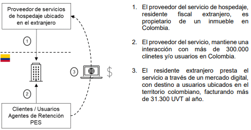 4. Sobre el particular, el parágrafo 1 del artículo 20-3 del Estatuto Tributario señala que «se presume que existe una (s) interacción (es) deliberada (s) y sistemática (s) en el mercado colombiano, esto es, con cliente(s) y/o usuario(s) ubicado(s) en el territorio nacional cuando: 1. La persona no residente o entidad no domiciliada en el país mantenga una interacción o despliegue de mercadeo con trescientos mil (300.000) o más clientes y/o usuarios ubicados en el territorio colombiano durante el año gravable anterior o el año gravable en curso; o 2. La persona no residente o entidad no domiciliada en el país mantenga o establezca la posibilidad de visualizar precios en pesos colombianos (COP) o permitir el pago en pesos colombianos (COP).»