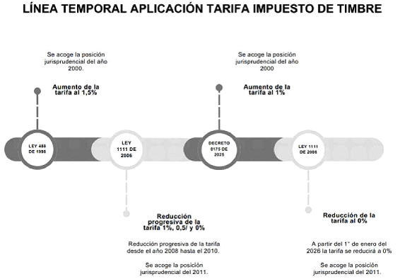 18. Ahora bien, con la entrada en vigencia del Decreto 0175 del 14 de febrero de 2025, el Gobierno Nacional, en uso de facultades extraordinarias, modificó la tarifa del impuesto de timbre nacional del 0% al 1% hasta el 31 de diciembre de 2025. Esto implica que a partir del 1 de enero de 2026 la tarifa del impuesto de timbre vuelve a ser del 0% conforme a lo previsto en la Ley 1111 de 2006.