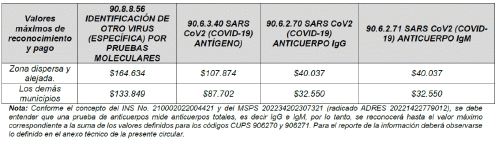 "Artículo 16. Valores a reconocer. De acuerdo con las disposiciones del Ministerio de Salud y Protección Social, los valores máximos de reconocimiento y pago de pruebas de búsqueda, tamizaje y diagnóstico para SARS CoV-2 - COVID-19 que, serán reconocidos por la ADRES son los siguientes: