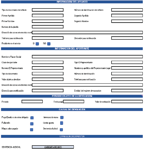 | 15 | Causal por la cual se solicita la devolución de cotizaciones | Corresponde a la causal en la cual se enmarca la solicitud de devolución de aportes: 1. Pago errado o sin estar obligado: Corresponde a las cotizaciones o valor de la UPC adicional, pagada de manera errada, cotizantes que no se encontraba activos a una EPS o porque pagó sin estar obligado a hacerlo. 2. Aportes por personas fallecidas: Corresponde a las cotizaciones efectuadas por un afiliado que para el periodo del aporte había fallecido. 3. Conciliación entre ESE y EPS (SGP): Corresponde a la solicitud realizada por la EPS la cual es de cotizaciones correspondientes a excedentes del Sistema General de Participaciones SGP, previa conciliación con las ESE. 4. Intereses de mora: El interés moratorio es el pago adicional que se debe realizar siempre que se paguen de forma extemporánea los aportes a seguridad social. Para su procedencia se requerirá que la cotización del afiliado haya sido devuelta por este subproceso o por el de corrección de registros compensados. 5. Recaudo fuera de PILA: Corresponde a las cotizaciones recaudadas por un mecanismo diferente al de la Planilla Integrada de Liquidación de Aportes de cotizaciones diferentes a recursos del Sistema General de Participaciones. 6. Recaudo fuera de PILA: Corresponde a las cotizaciones recaudadas | 2 | Numérico |