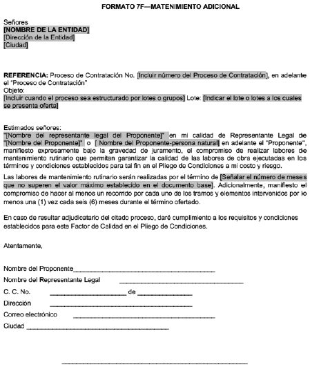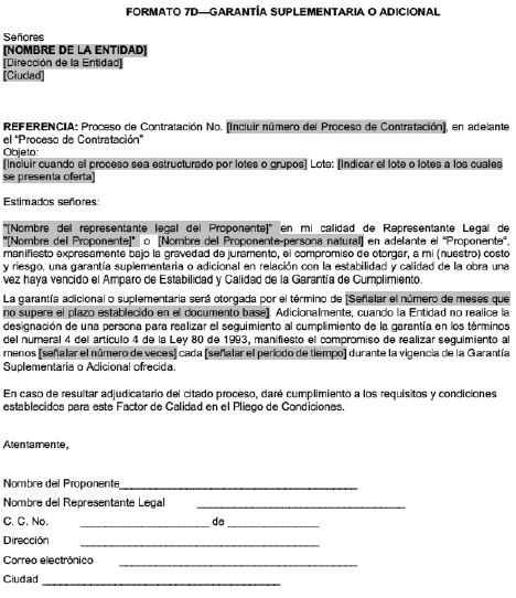 Que, para el otorgamiento de estos tres (3) factores de calidad los oferentes suscriben el Formato “7D – Garantía suplementaria o adicional”, el “Formato 7E – Cuadrillas de trabajo adicional” o el “Formato 7F- Mantenimiento adicional”, dependiendo del factor de calidad que la entidad elija de acuerdo con las características del objeto a contratar. En estos formatos, el oferente indica el número de meses de garantía adicional, el número de cuadrillas de trabajo adicional y, finalmente, el plazo de mantenimiento rutinario que ofrece en relación con el factor de calidad.