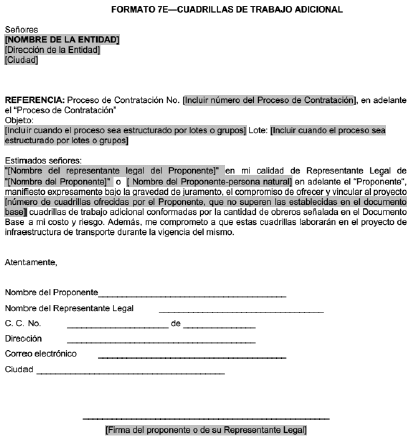 El proponente ofrecerá 1 cuadrilla adicional por cada 50 obreros que sean requeridos para el proyecto de infraestructura de transporte. [P.ej. en el caso que para un proyecto sean estimados un total de 100 obreros para poder ejecutar el objeto contractual, se podrán ofrecer hasta máximo 2 cuadrillas]