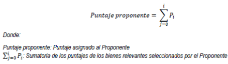 Definido el puntaje de cada bien nacional relevante, la Entidad Estatal otorgará el puntaje a cada Proponente dependiendo de la cantidad de bienes nacionales relevantes ofertados y el puntaje individual asignado a cada uno de ellos. Para la asignación de este puntaje se aplicará la siguiente fórmula.