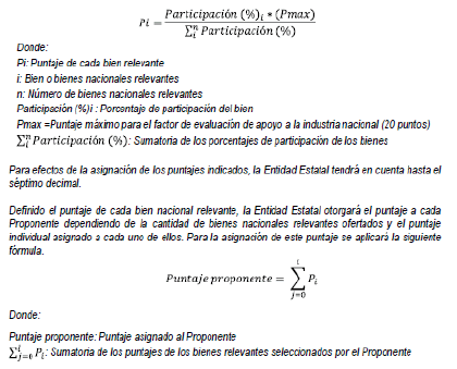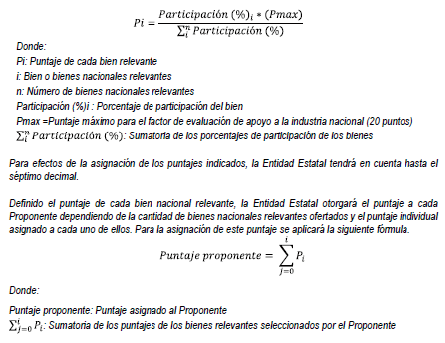 Para efectos de la asignación de puntaje, la Entidad Estatal definirá el puntaje de cada bien nacional relevante de acuerdo con su porcentaje de participación, para lo cual aplicará la siguiente fórmula.