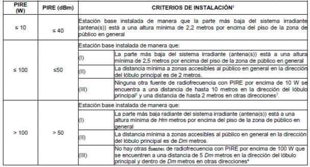 3. Cuando esta condición no se cumple la instalación seguiría cumpliendo si la suma de la PIRE de las fuentes EUT o estaciones base y cercanos es menos de 100 W. Si el PIRE total es superior a 100 W, entonces el equipo sometido a prueba sigue cumpliendo si se instala en una altura mínima de Hm metros por encima del piso de la zona de acceso a público en general y a una distancia mínima desde las zonas accesibles al público en general en la dirección principal del lóbulo de Dm metros, donde se obtienen Hm y Dm utilizando las ecuaciones 1 a 3 para la suma de las PIRE incluidas las de fuentes cercanas.