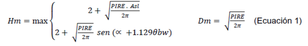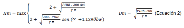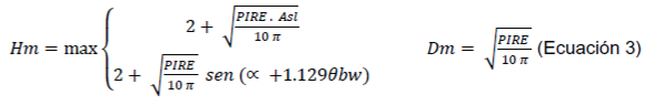 4. Cuando esta condición no se cumple la instalación sigue siendo eximida de la realización de mediciones si la EUT está instalada a una altura mínima de Hm metros por encima del piso de la zona de acceso al público en general y a una distancia mínima desde las áreas accesibles al público en general en la dirección del lóbulo principal de Dm metros, donde Hm y Dm son obtenidas usando las ecuaciones 1 a 3 para la suma de las PIRE incluyendo aquellas de fuentes cercanas.