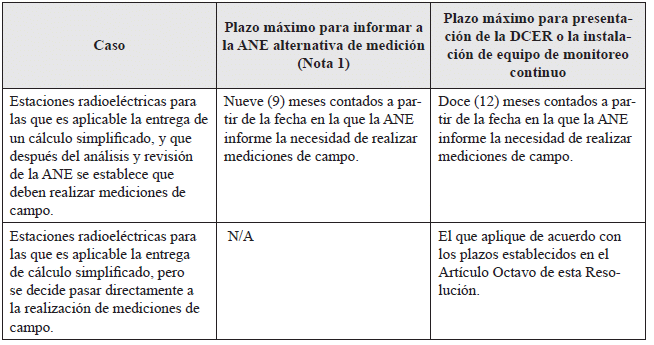 En cualquiera de los tres casos anteriores, si el cálculo simplificado indica que se requiere realizar mediciones de campo, deberán atenderse los plazos definidos en el artículo décimo de la presente resolución.