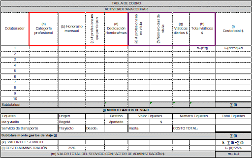 Valor total del servicio. = [ (a. Honorarios x dedicación hombre/mes) + (b. Total viáticos + gastos de viaje) + (c. valor de los análisis de laboratorio, otros estudios y diseños técnicos)] + [(a+b+c) * (Gastos de administración según resolución del Ministerio de Ambiente y Desarrollo Sostenible)].
