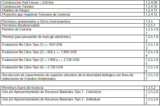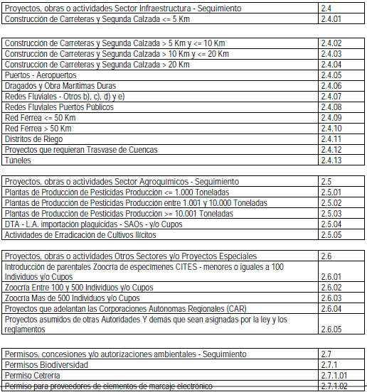 ARTÍCULO 4o. ACTIVIDADES Y AUTORIZACIONES SUSCEPTIBLES DE COBRO EN LA ETAPA DE SEGUIMIENTO. Las siguientes actividades, licencias ambientales, permisos, autorizaciones y demás instrumentos de control y manejo ambiental, y las demás que le sean asignadas por la ley y los reglamentos, son susceptibles de cobro en seguimiento por parte de la Autoridad Nacional de Licencias Ambientales (ANLA):