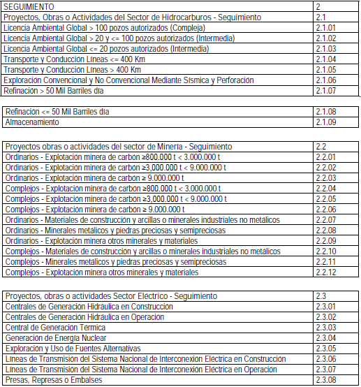 ARTÍCULO 14. TARIFAS DE PROYECTOS, OBRAS O ACTIVIDADES DE LOS DISTINTOS SECTORES POR EL SERVICIO DE SEGUIMIENTO. Las categorías, dedicación y duración de las visitas de los profesionales (funcionario y/o contratista) que requiera la Autoridad Nacional de Licencias Ambientales (ANLA) para el seguimiento de los instrumentos de control y manejo ambiental de su competencia, están contenidas en las tablas que se describen a continuación, las cuales se encuentran integradas al anexo que hace parte integral de la presente resolución: