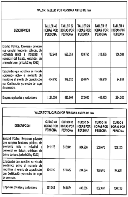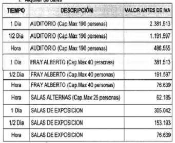 ARTÍCULO 6o. SERVICIO DE ALQUILER DE ESPACIOS PARA FERIAS DE SERVICIOS. El alquiler de cada uno de los espacios para exposición de 2.00 m de profundidad x 2.50 m de ancho, dotado con conexión eléctrica e iluminación. El valor del alquiler del espacio incluye los tres (3) días del evento, y será por la suma de setecientos mil pesos ($700.000) moneda corriente, antes de IVA, que deberán ser consignados en la cuenta corriente número 110-040001885 del Banco Popular a nombre del Archivo General de la Nación, con un plazo máximo de pago hasta quince (15) días calendario previo a la realización del evento.