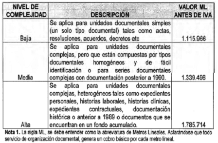 ARTÍCULO 9o. PROCESO DE ORGANIZACIÓN DOCUMENTAL. Es un proceso mediante el cual se desarrollan actividades de clasificación, ordenación y descripción de los fondos documentales de las entidades, respetando el principio de procedencia y orden original. Las tarifas establecidas para el proceso de Organización Documental dependen del nivel de complejidad de las unidades documentales a intervenir y son las siguientes: