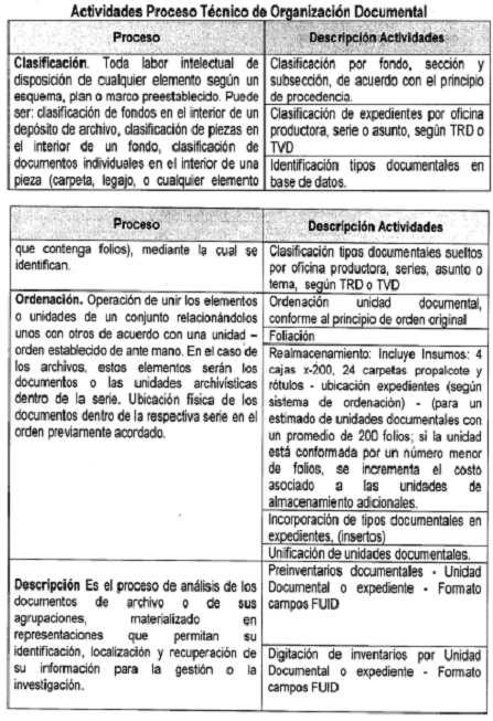 Las actividades que conforman un proceso tecnico de organizacion y cuyo costo esta incluido en la tarifa anteriormente establecidad son: