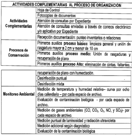 El proceso de Organización Documental puede incluir, además de las actividades relacionadas, una serie de actividades complementarias cuyo costo no se encuentra contemplado en la tarifa citada y que en caso de ser requeridas por la entidad contratante se costearán de manera independiente de acuerdo con los valores estimados por mano de obra profesional y técnica, insumos y demás gastos que demanden actividades y que se relacionan a continuación.