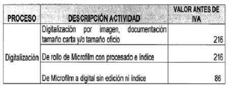 ARTICULO 10. SERVICIO DE DIGITALIZACION. Proceso tecnico que permite convertir un documento en soporte analogico (papel, microfilm) en uno o varios archivos digitales que contienen la imagen codificada, fiel e integra del documento.La tarifa establecida para este proceso es la siguiente: