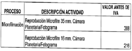 ARTICULO 11. SERVICIO DE MICROFILMACION. Proceso tecnico que permite tener una reproduccion exacta de un documento sobre un soporte fotografico normalizado, para preservacion a largo plazo, La tarifa establecidad para este proceso es la siguiente: