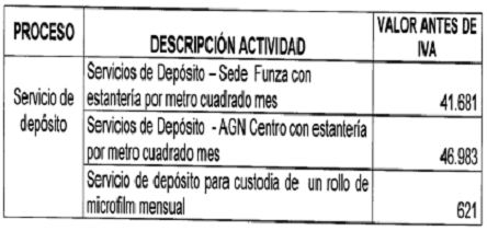 ARTICULO 12. SERVICO DE DEPOSITO. El servicio mediante el cual se pone a disposicion de las entidades depositos con estanteria para el almacenamiento de documentacion, cumpliendo con los protocolos establecidos en cuanto a seguridad y cumplimiento normativo, la tarifa establecida para este proceso es la siguiente: