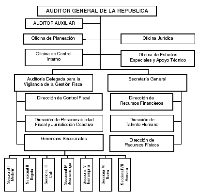 Que la organización administrativa de la Auditoría General de la República está señalada por los artículos 9o y 10 del Decreto-ley 272 de 2000, con las creaciones y modificaciones de sede que faculta el artículo 11 ib y su organigrama es el siguiente: