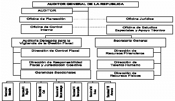 Que la organización administrativa de la Auditoría General de la República está definida en el Capítulo II, artículo 9o. Organización administrativa, y artículo 10. Sedes y niveles de organización del Decreto 272 de 2000, siendo su organigrama el siguiente.