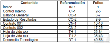 Se debe emplear en este archivo la letra I como referencia alfabética y el número consecutivo de cada documento, que puede tener varios folios. Esta documentación se deberá identificar como en la siguiente tabla: