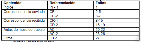 Para su estandarización, se ha implementado una referenciación alfabética propia basada en los diferentes procesos, la cual se complementa con la respectiva foliación, tal como se describe a continuación: