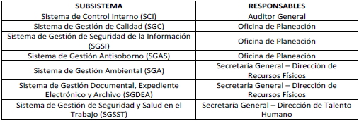 ARTÍCULO 6o. RESPONSABLES DE LOS SUBSISTEMAS DEL SISTEMA DE GESTIÓN INTEGRADO (SGI).