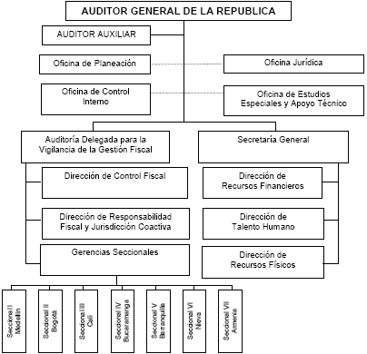 Que la organización administrativa de la Auditoría Generalde la República está señalada por los artículos 9o y 10 del Decreto-ley 272 de 2000, con las creaciones y modificaciones de sede que faculta el artículo 11ib y su organigrama es el siguiente: