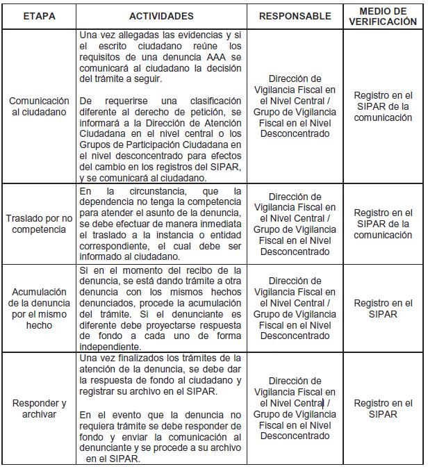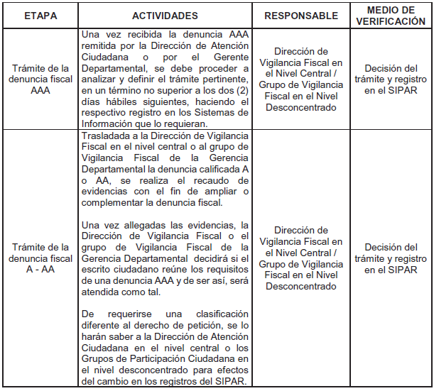 Una vez recibida la denuncia fiscal AAA, el funcionario de la Dirección de Vigilancia Fiscal en el Nivel Central o funcionario del Grupo de Vigilancia Fiscal en el Nivel Desconcentrado define el trámite y lo registra en los sistemas de información que correspondan.