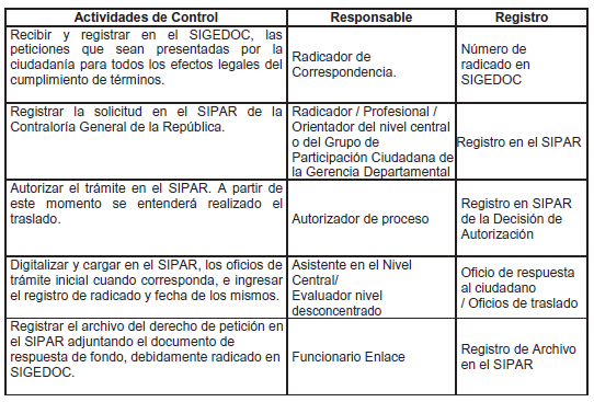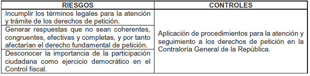A continuación se relacionan las actividades de control frente a los riesgos que puedan afectar el logro del objetivo del Procedimiento para la atención, trámite y seguimiento de las denuncias fiscales y los demás derechos de petición en la CGR, las cuales deberán cumplirse en los puntos de control que corresponda.