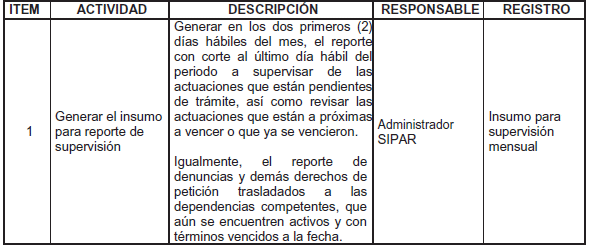 Adicionalmente, y como actividades de control y seguimiento del procedimiento, se adelantarán las expuestas a continuación: